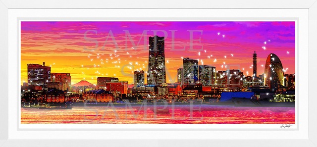 横浜の「みなとみらい」の夕暮れを描いた作品。富士山も夕日に照らし出され作品全体で美しいオレンジからピンクへのグラデーションが描かれています。 ■■オンラインショップ限定!非買品ミニ版画作品(約A4サイズ〉がもれなく付いてきます■■ ※ミニ版画作品は時期により絵柄が変わります。 シートサイズ(絵柄部分のサイズ)900-339mm 作品の左下にEDITION番号(番号はお選びできません)と、右下に鉛筆でLEON TERASHIAM自筆のサインが入ります。 額装時の外寸は、約1100mmー550mm 木製(ホワイト)・ダブルマット仕様(ホワイト)・アクリル板・背面に壁掛け用の紐の取り付け金具。