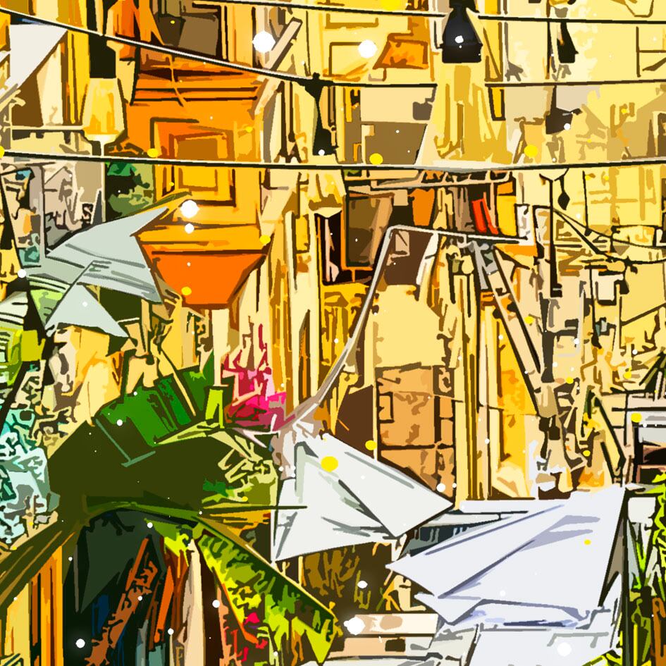 があります。そんなピザ店の開店前の静かな昼下がりの古き美しい路地を描いた作品。