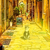 マルタ共和国の首都バレッタの路地で太陽を見上げる1匹の猫。まるで黄金の光に吸い込まれ