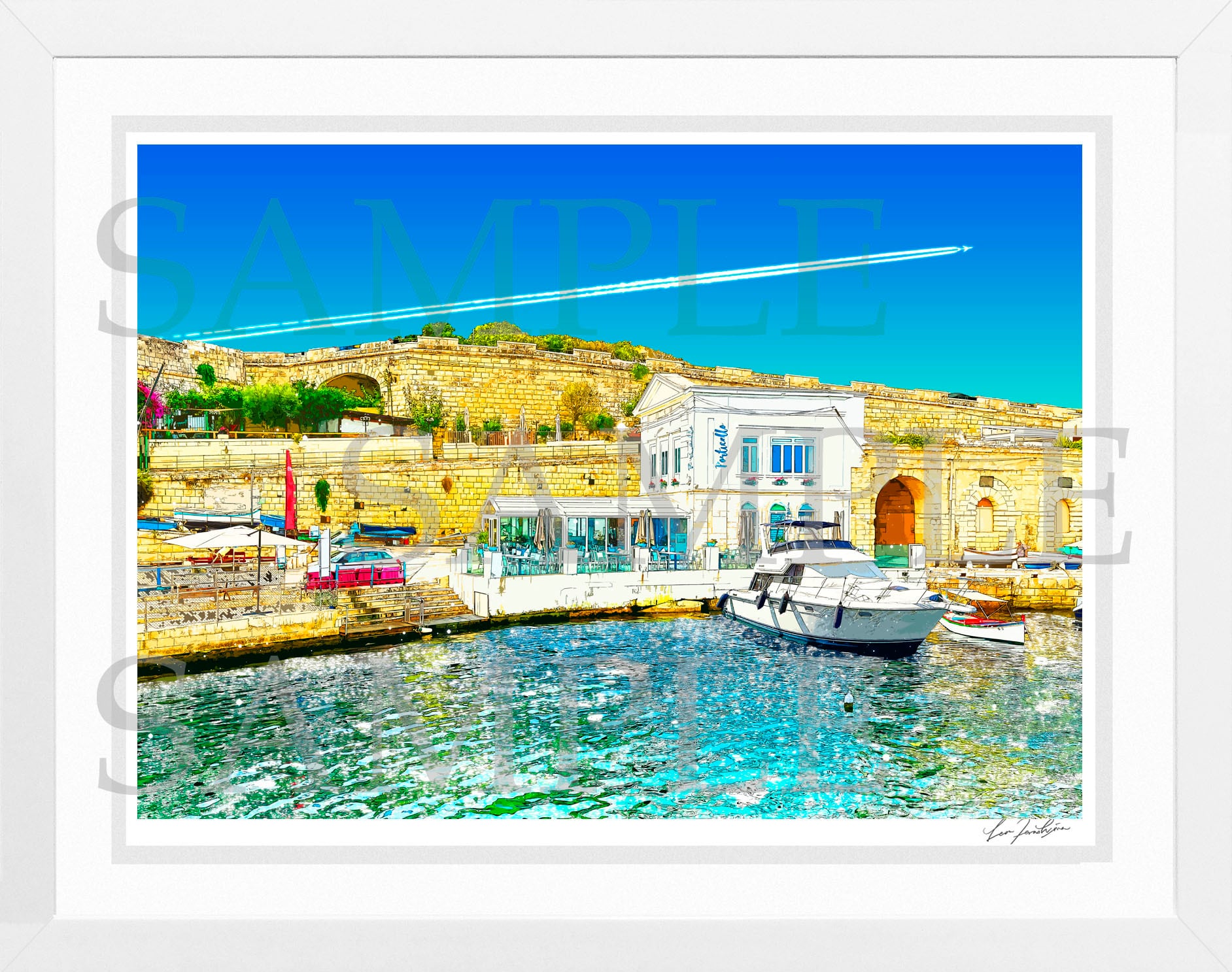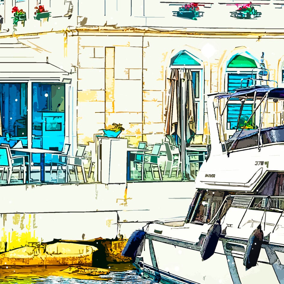 マルタ共和国のバレッタのの小さな港。美しい海に白く輝くたくさんの光が描かれています。