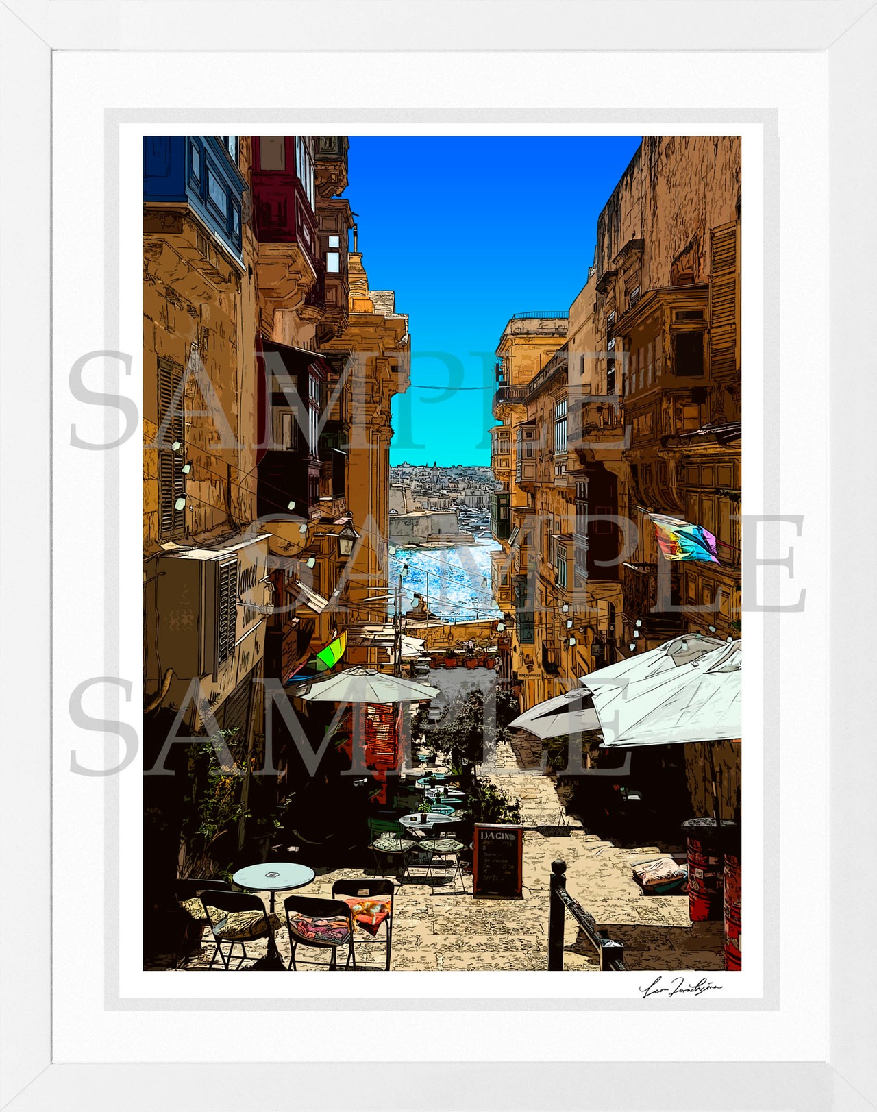 マルタ共和国を描いた非売品のA2サイズのポスターを木製フレームに入れてプレゼント。