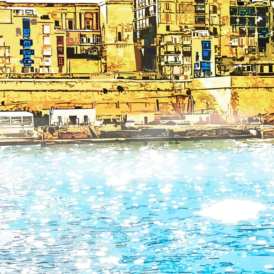 マルタ共和国の首都バレッタからスリマまでの定期船の後部から見たバレッタを描いた作品。
