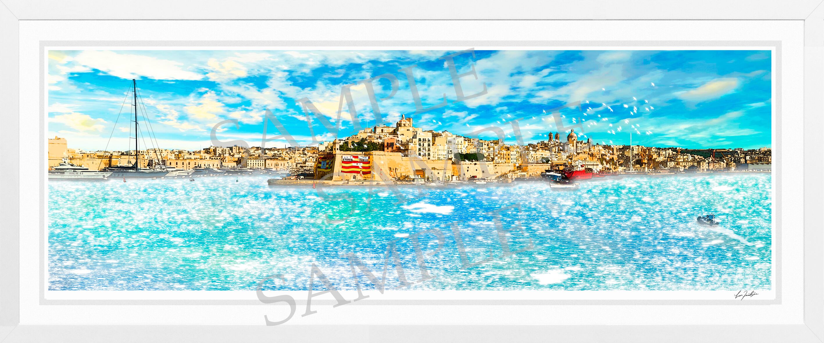 マルタ共和国を描いた非売品のA2サイズのポスターを木製フレームに入れてプレゼント。